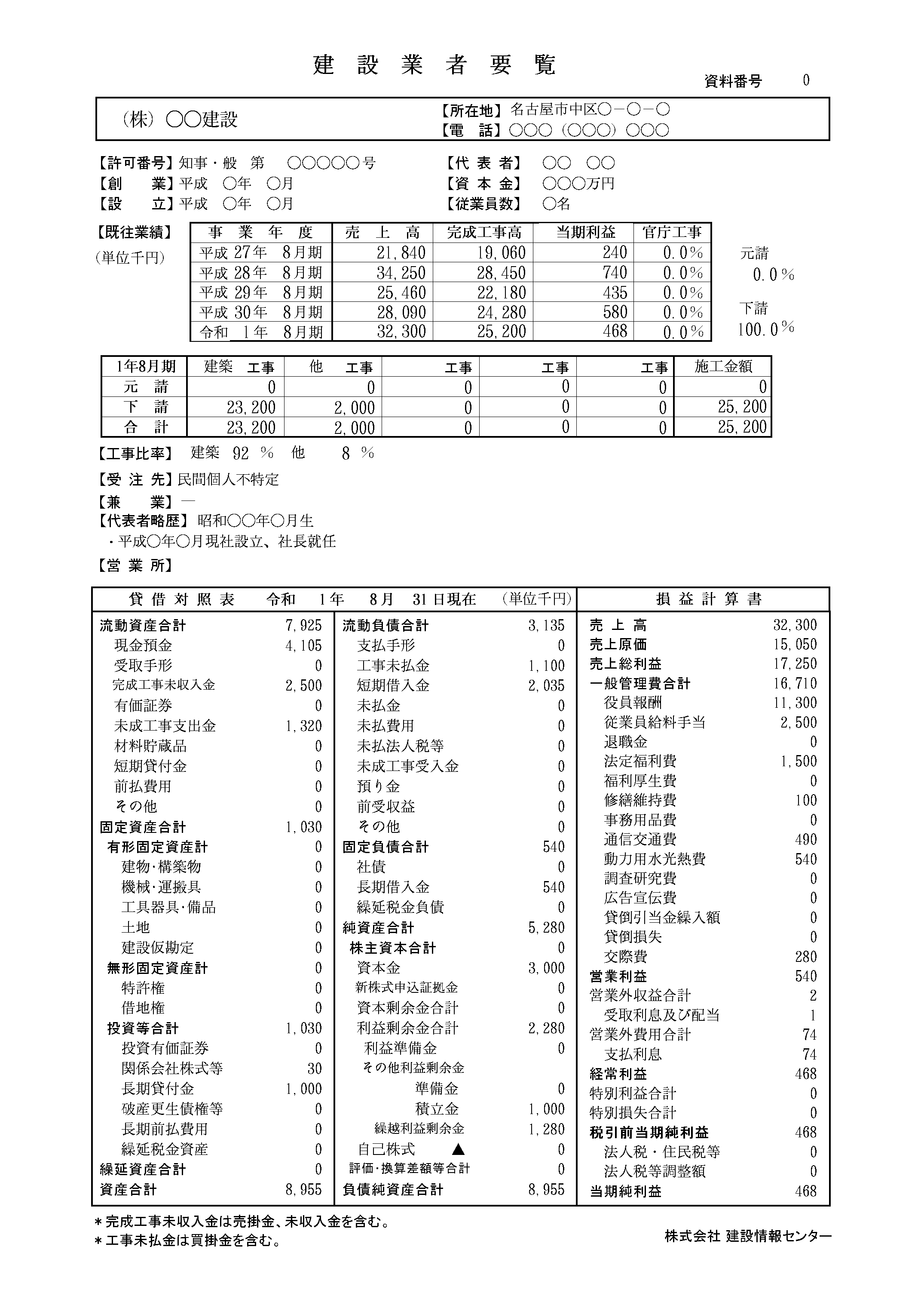 - 建設業許可業者の貸借対照表、損益計算書を収録。